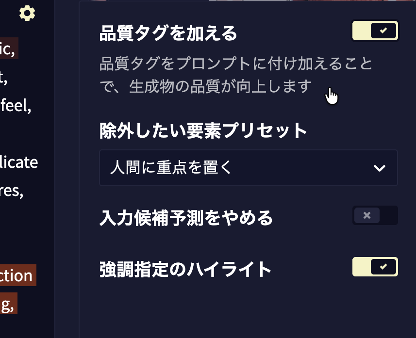 このボタンをオンにすると、あなたがプロンプトを入力したときに、見えないところで「自動的に」品質タグが追加されます。